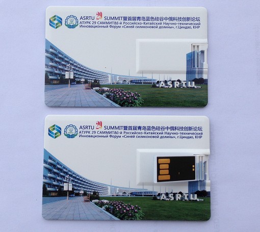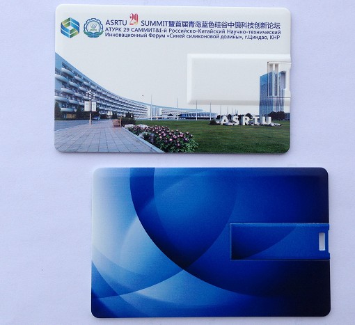 青島藍色硅谷中俄科技創新論壇定制高清卡片U盤,卡片正面為藍色背景非常高檔,卡片反面為ASRTU大樓非常大氣,