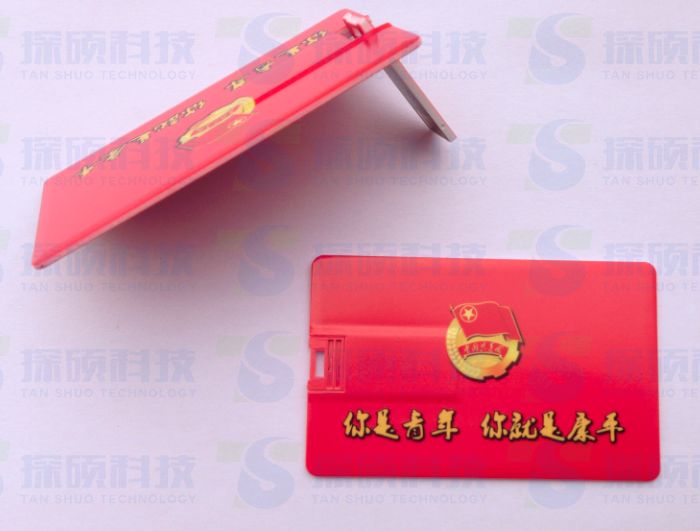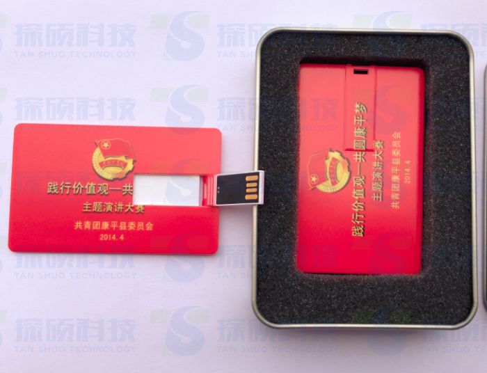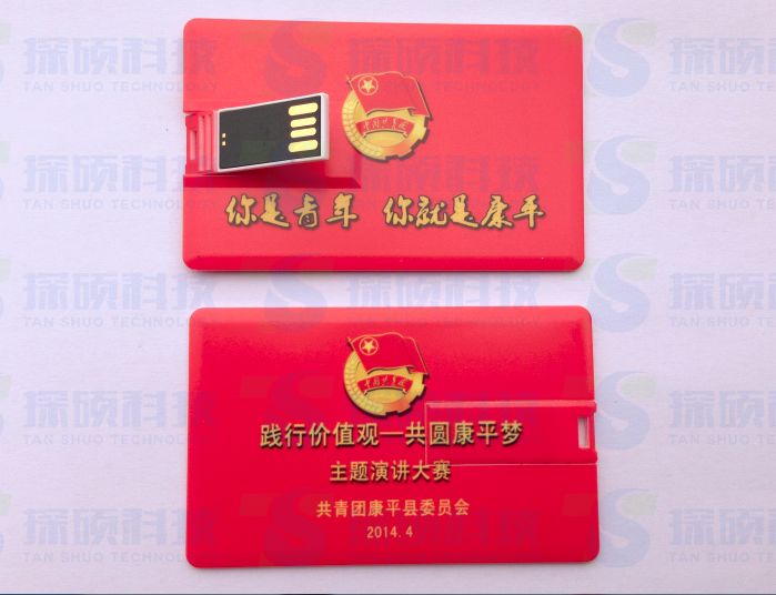 沈陽康平縣委會定制卡片U盤,外觀采用塑膠表面噴油,雙面高清彩印,360度自由旋轉功能,卡片U盤尺寸:85X52X2MM