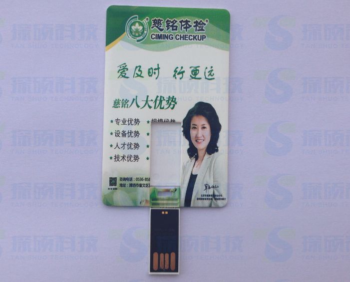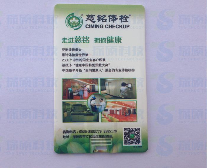 這款防水卡片U盤材質(zhì)采用塑膠,可雙面高清彩印公司圖案,科防水防塵功能,使用起來和攜帶非常方便,慈銘體檢集團(tuán)選著這款卡片U盤作為公司VIP客戶禮品,是醫(yī)療行業(yè)禮品最佳,卡片U盤尺寸85x52x2