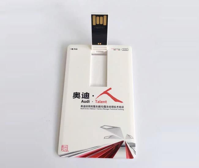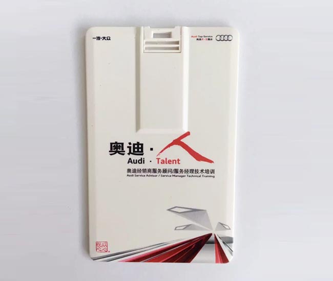 奧迪公司定制超薄卡片U盤紀念品,作為奧迪技術服務培訓中心贈送給學員U盤紀念品。這款卡片U盤長85mm,寬45mm,厚度2mm,凈重12g,大小如一張名片一般,可以隨身攜帶放在錢包或者名片夾中,LOGO印刷面積大,用戶使用頻率高,十分適合作為一款禮品U盤,廣告性極強!