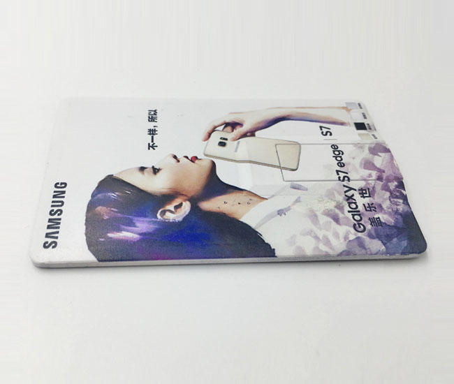 卡片OTGU盤 三星蓋樂世手機定制卡片式手機U盤禮品,這款手機U盤是三星發布蓋樂世S7時定制的卡片式手機U盤,卡片U盤的外觀造型以及大小都是參照銀行卡的大小造型進行設計,U盤正面裝飾以三星S7的代言人的側面進行裝飾,正面最頂端是三星的logo標志,底端部分則是三星S7的手機完整名稱,當你需要使用到這款U盤的時候,輕輕的抽出連接電腦的USB端口,然后進行360度旋出使用,使用完了以后旋轉回縫隙中推入直到邊緣與U盤底面重合,而U盤的背面則是我們前段時間幾乎大部分的年輕人都在追的韓劇《太陽的后裔》來進行背面填充,是一款走在時尚前線的一款U盤。