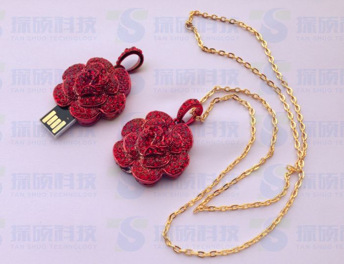 探碩U盤廠家定制玫瑰花珠寶U盤,鋅合金電鍍紅色表面鑲鉆石,簡單大方是送給情侶友人最佳禮品,